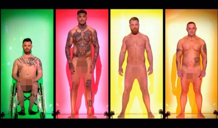 Naked Attraction The format is simple: one person chooses a partner from six candidates standing behind glass panels, completely naked. The panels rise from the bottom up — first you see only legs and genitals, then the torso, then the face. The host comments on the proceedings with the energy of someone discussing the weather. “Hmm, interesting choice. What do you think about the size of his penis?” Then a happy couple heads off on a date. Airs on Channel 4 in prime time since 2016.