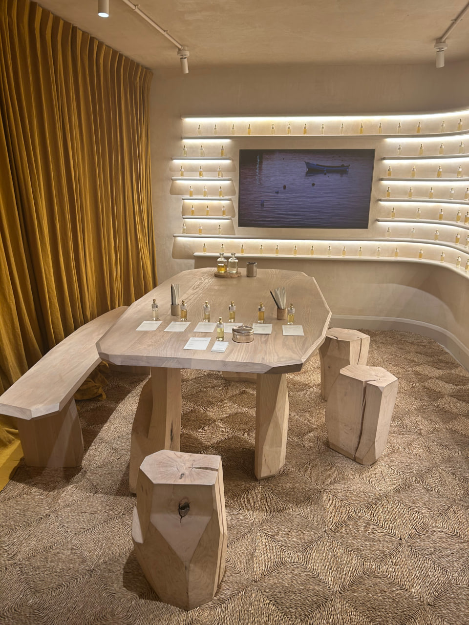 The Soho store feels more like a workshop: vintage furniture, natural materials, a complete visual detox. Inside, you can sample the current seasonal scent and explore the archive — a collection of returned bottles stored under controlled conditions, available on request to active ledger members.