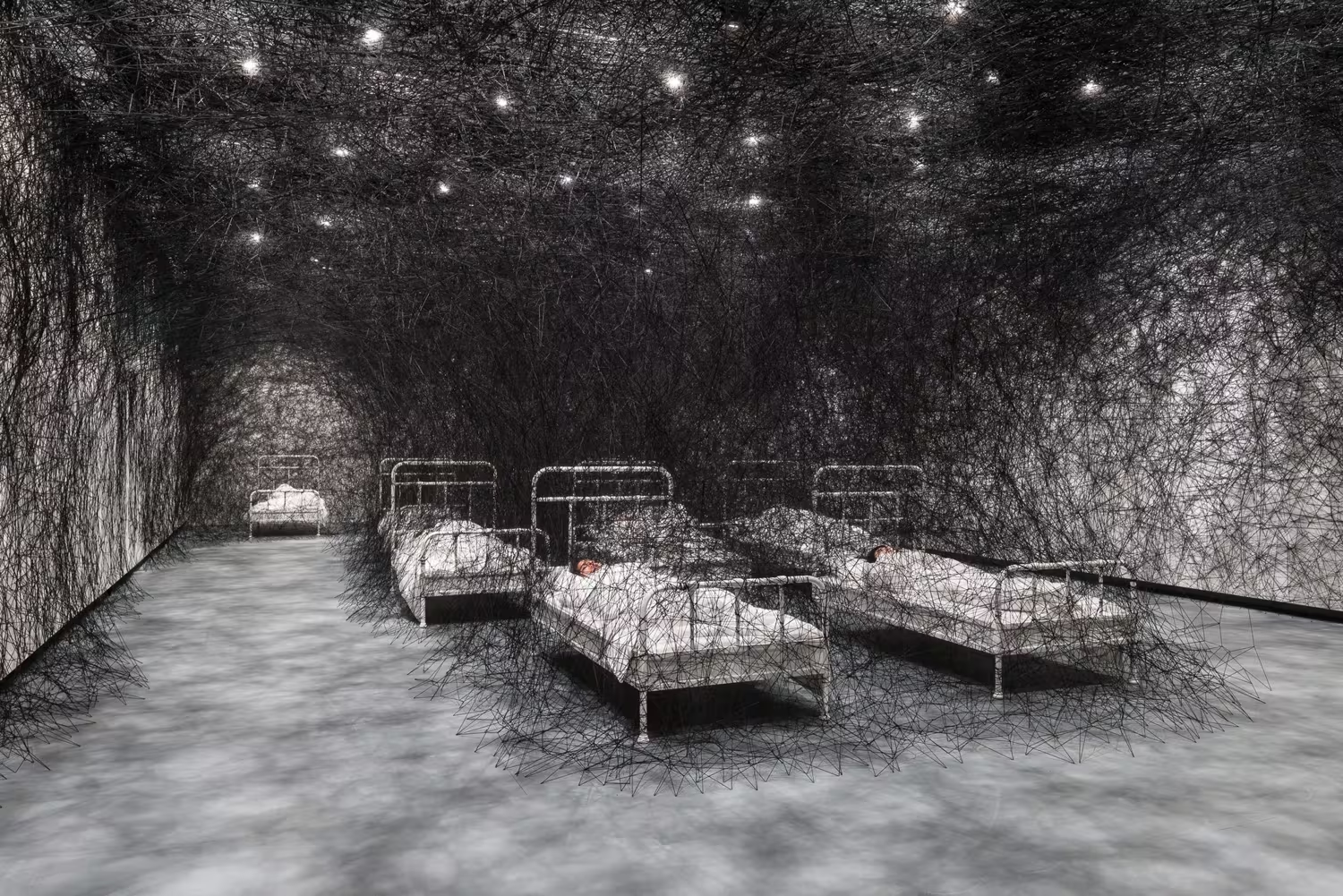 During Sleep is an installation with a performance: women lying in hospital beds encased in dense black thread. Still, enclosed, barely visible inside the web. It looks like what it is — the fragility of a body, the weight of staying alive. Happens monthly, free with a ticket. 7 March, 11 April, 2 May, 10am–1pm.
